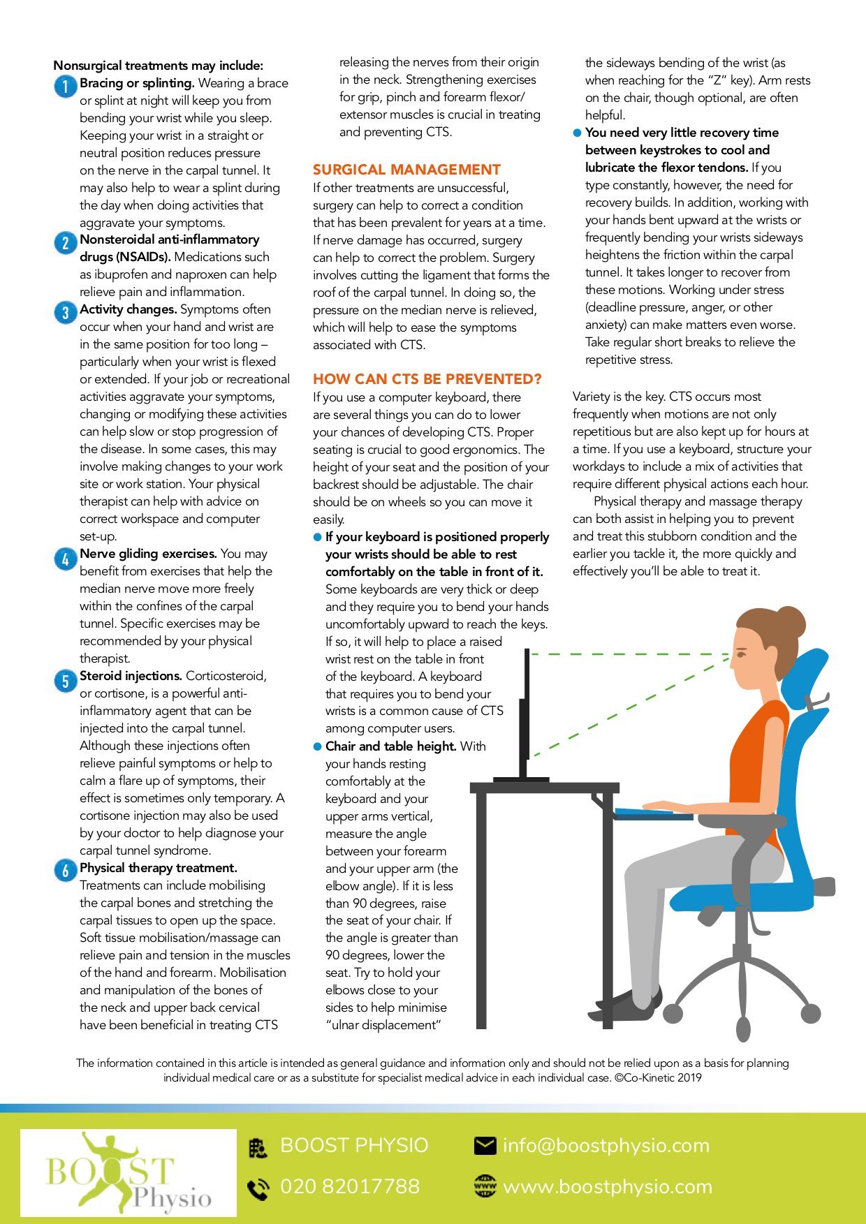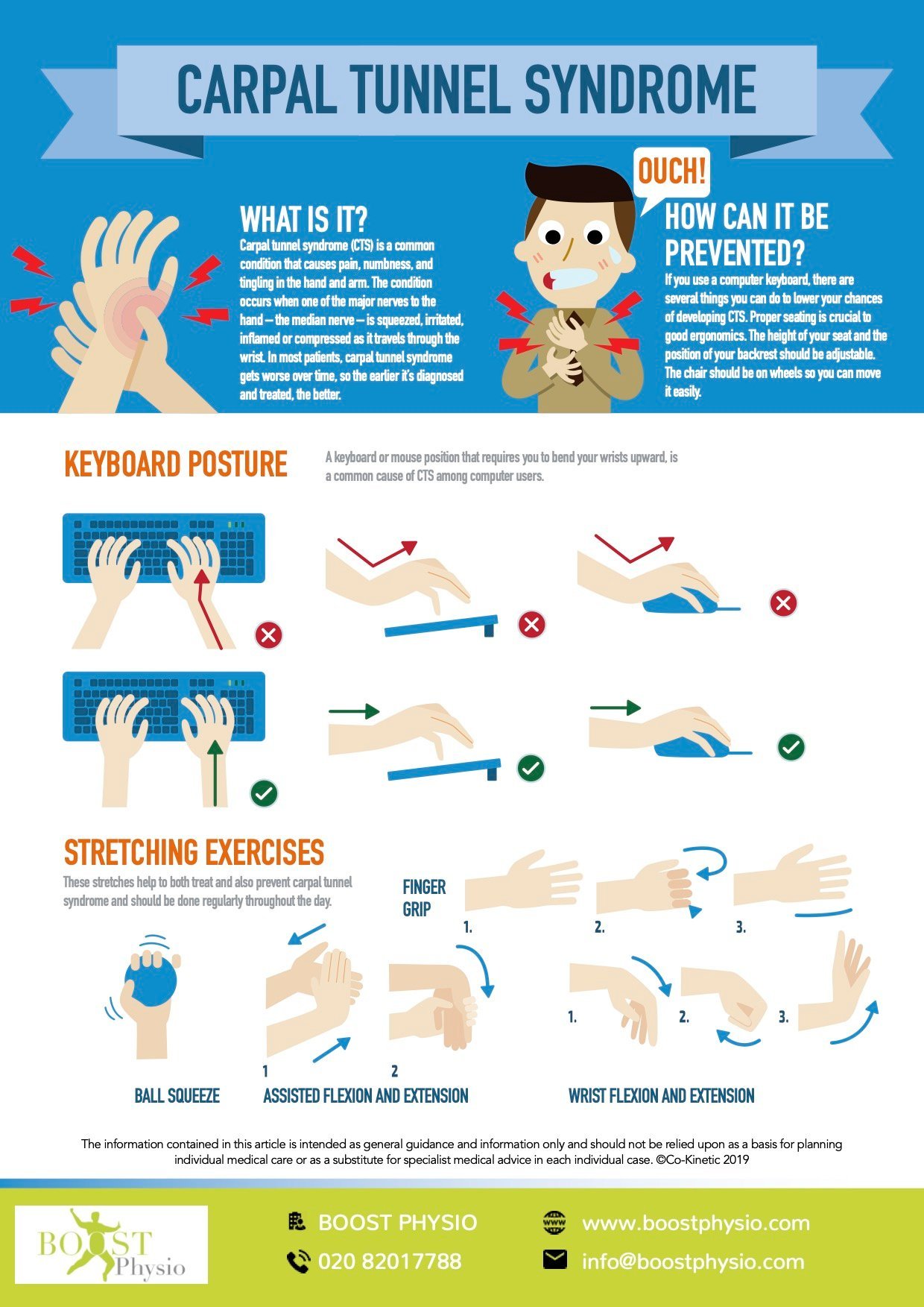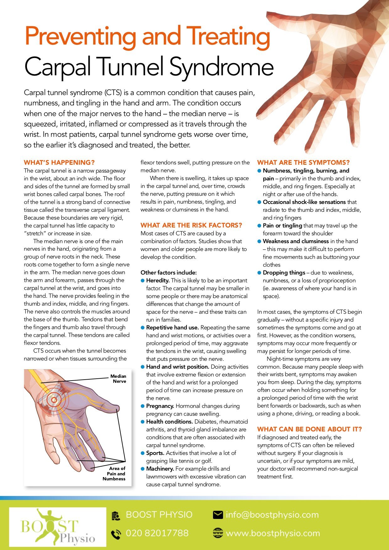 Physiotherapy for Carpal Tunnel Syndrome involves improving posture and exercises to relieve pressure on the wrist and glide the median nerve- which is the nerve being compressed to relieve pressure.
