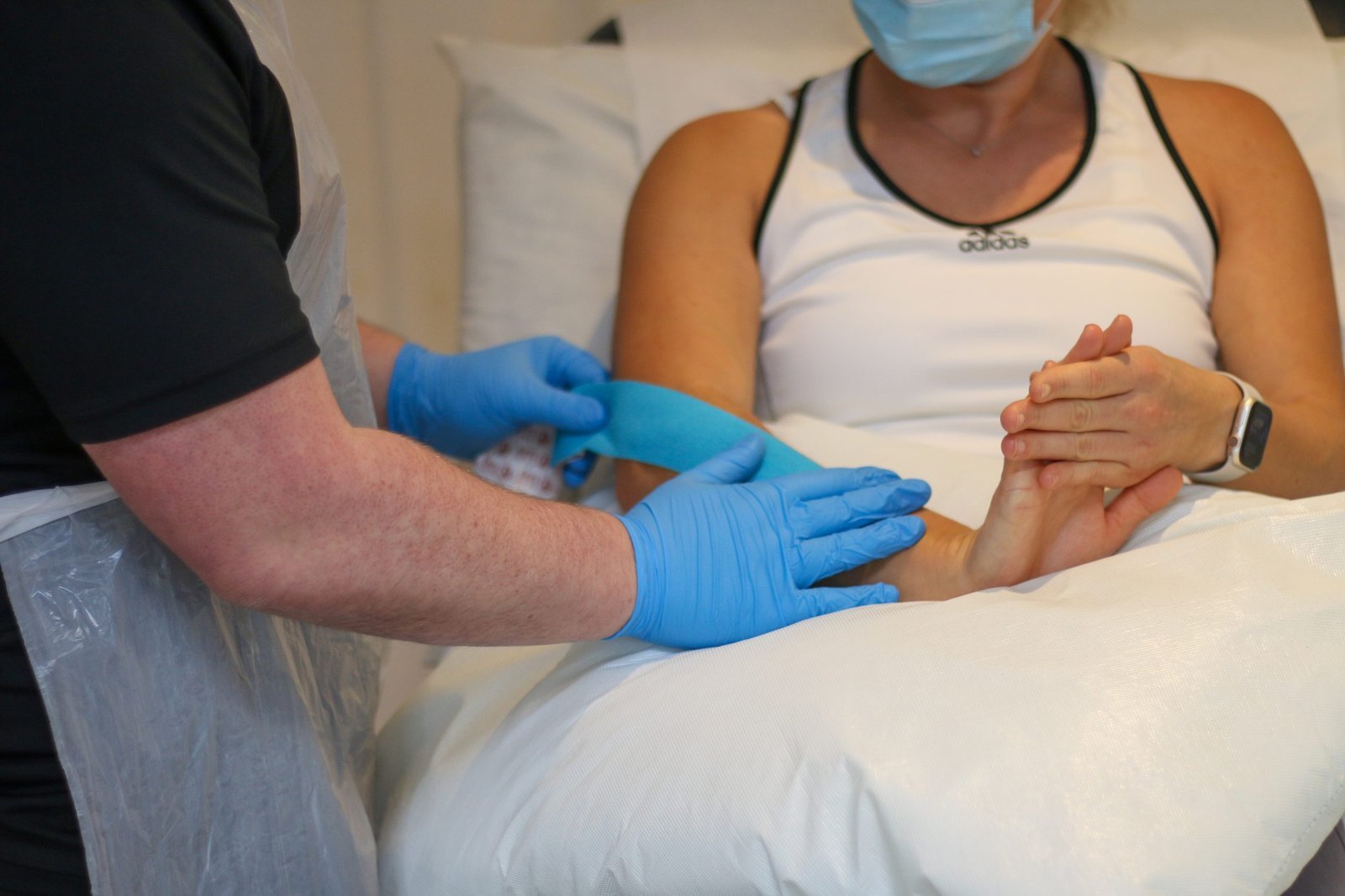 - K-tape to the elbow and forearm to off-load tension in the muscles.